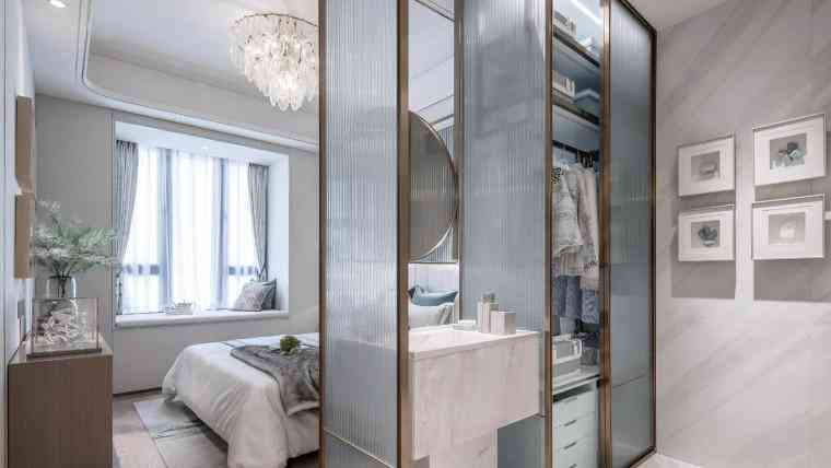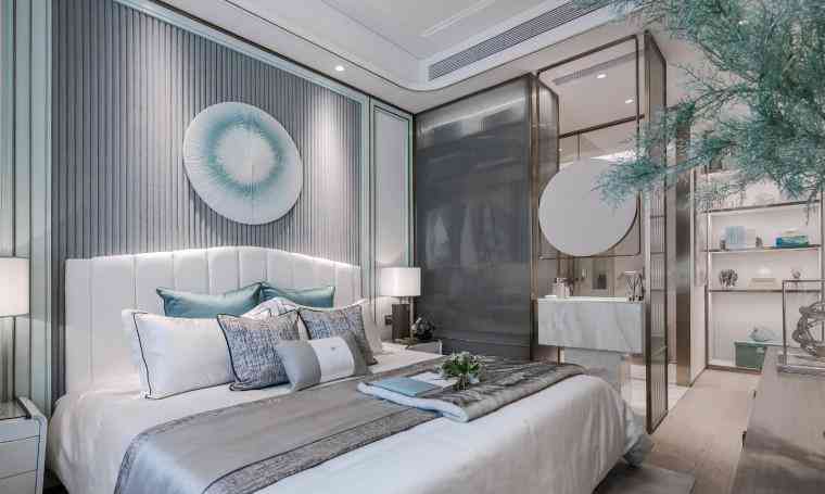 從玄關(guān)轉(zhuǎn)入客廳,浪漫感、幸福感撲面而來,灰白底色的柔和調(diào)性,被蒂芙尼藍星星點綴著,令人眼前一亮,放松身心。這種現(xiàn)代簡約的構(gòu)造,勾勒出一個精致優(yōu)雅的藍色風(fēng)情家,讓人身處繁華的鬧市中,心情也能平靜舒暢??筒蛷d貫穿天花,用通高的門與藝術(shù)玻璃隔斷,視野不受影響,在餐廳忙碌的人仍能感覺到從客廳沙發(fā)傳來的舒適與溫馨。餐廳同樣采取蒂芙尼藍為主體色,金屬質(zhì)感的壁柜擴大儲物可能性。色彩承載的真正意義,是平凡生活中的驚喜,是對幸福生活的向往。在精致餐具的烘托下,惹人放慢腳步,與家人同享浪漫的用餐時光。杯盞間深情淺笑,微醺時促膝長談,無關(guān)風(fēng)雨,樂享當(dāng)下。光與美,熱烈與浪漫、溫暖與幸福、璀璨與永恒在這里綻放。 臥室 臥室是人們心所歸處。主臥利用步入式衣帽及展示柜。開放式主臥衛(wèi)生間、衣帽間、女主人的化妝臺交叉功能,面積配比不再是局限。