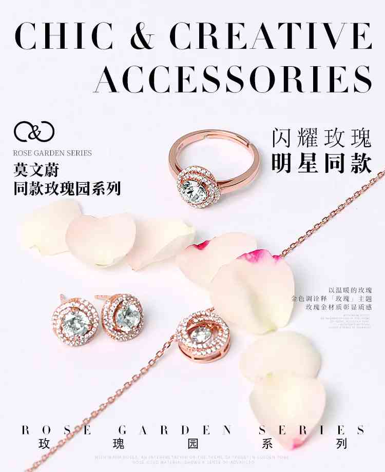 之所以叫玫瑰園,就是因為它的造型像玫瑰花一樣,鏤空底部凸顯5A級立方氧化皓石的光芒,邊緣鑲嵌皓石的花瓣交疊,綻放出純凈光彩。