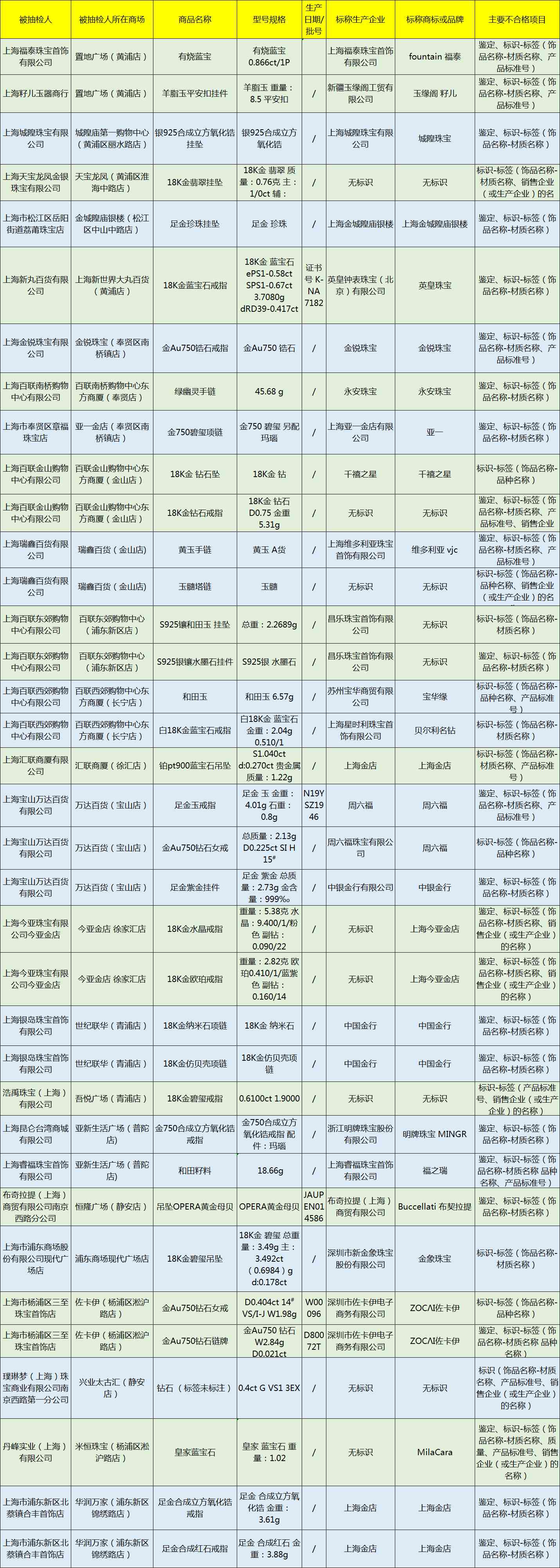 周六福珠寶有限公司生產(chǎn)(或供貨)的金Au750鉆石女戒、足金玉戒指,鑒定、標(biāo)識-標(biāo)簽不合格。上海匯聯(lián)商廈有限公司在匯聯(lián)商廈徐匯店銷售的標(biāo)稱由上海金店生產(chǎn)(或供貨)的“上海金店”牌鉑pt900藍寶石吊墜(型號規(guī)格:S1.040ct d:0.270ct 貴金屬質(zhì)量:1.22g),材質(zhì)名稱缺失,未標(biāo)注配鑲鉆石。國家標(biāo)準(zhǔn)要求,飾品名稱必須標(biāo)識所有的材料名稱,以便消費者對所買珠寶玉石有一個最直觀最全面的了解。