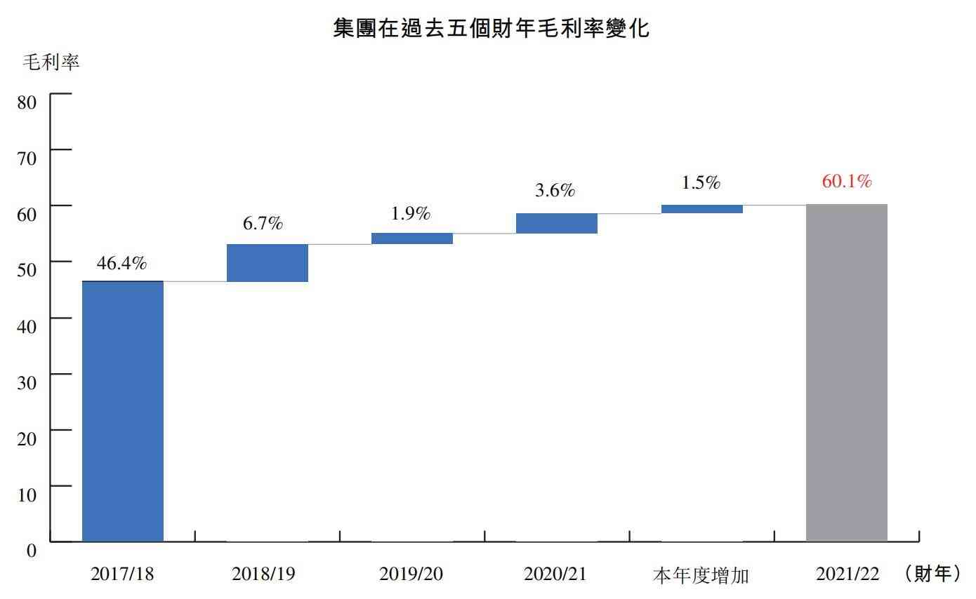 值得一提的是,波司登整體的毛利率也在過去五年間迅速增長,從2017/2018財(cái)年的46.4%,一路增長到21/22財(cái)年的60.1%。21/22財(cái)年,波司登品牌的毛利率同比增加3.2%至69.4%。“彰顯了我們這么多年品牌升級(jí)的效果?!敝旄叻逭f。