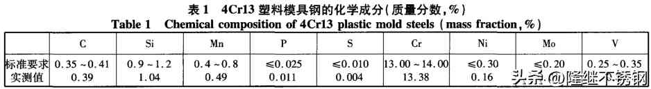 4Cr13塑料模具鋼的化學成分如表1所示。實際生產(chǎn)中要盡可能降低P、S含量,降低鋼中H、O、N含量,一般要求H含量≤2×10~6。要采用有效的工藝措施,提高鋼水純凈度和表面質(zhì)量,減少鋼錠的偏析、縮孔和疏松。