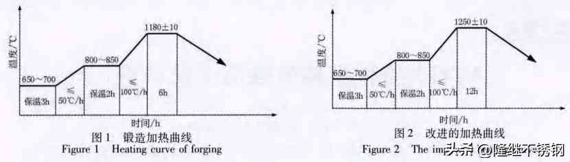 對首次生產(chǎn)的4Cr13塑料模具鋼模塊進行超聲檢測,在整個工件中心部位均發(fā)現(xiàn)D2 mm 以上的密集型缺陷,進而對缺陷部位進行高倍檢查,發(fā)現(xiàn)顆粒狀碳化物條帶。由于4Cr13塑料模具鋼在生產(chǎn)過程中屬于高碳鋼,而且合金含量比較高,極易出現(xiàn)微觀偏析的現(xiàn)象,在鋼錠加熱過程中通過提高始鍛溫度和增加保溫時間,進行高溫擴散,可有效降低偏析程度,實現(xiàn)化學成分均勻化,保證鍛件的內(nèi)部質(zhì)量。改進的加熱工藝如圖2所示。