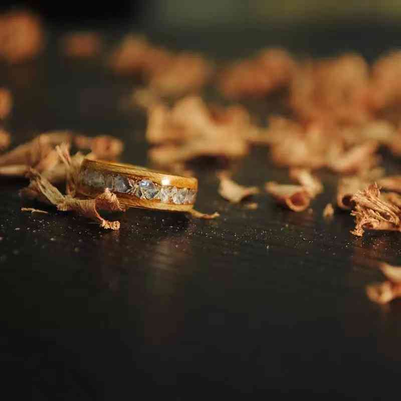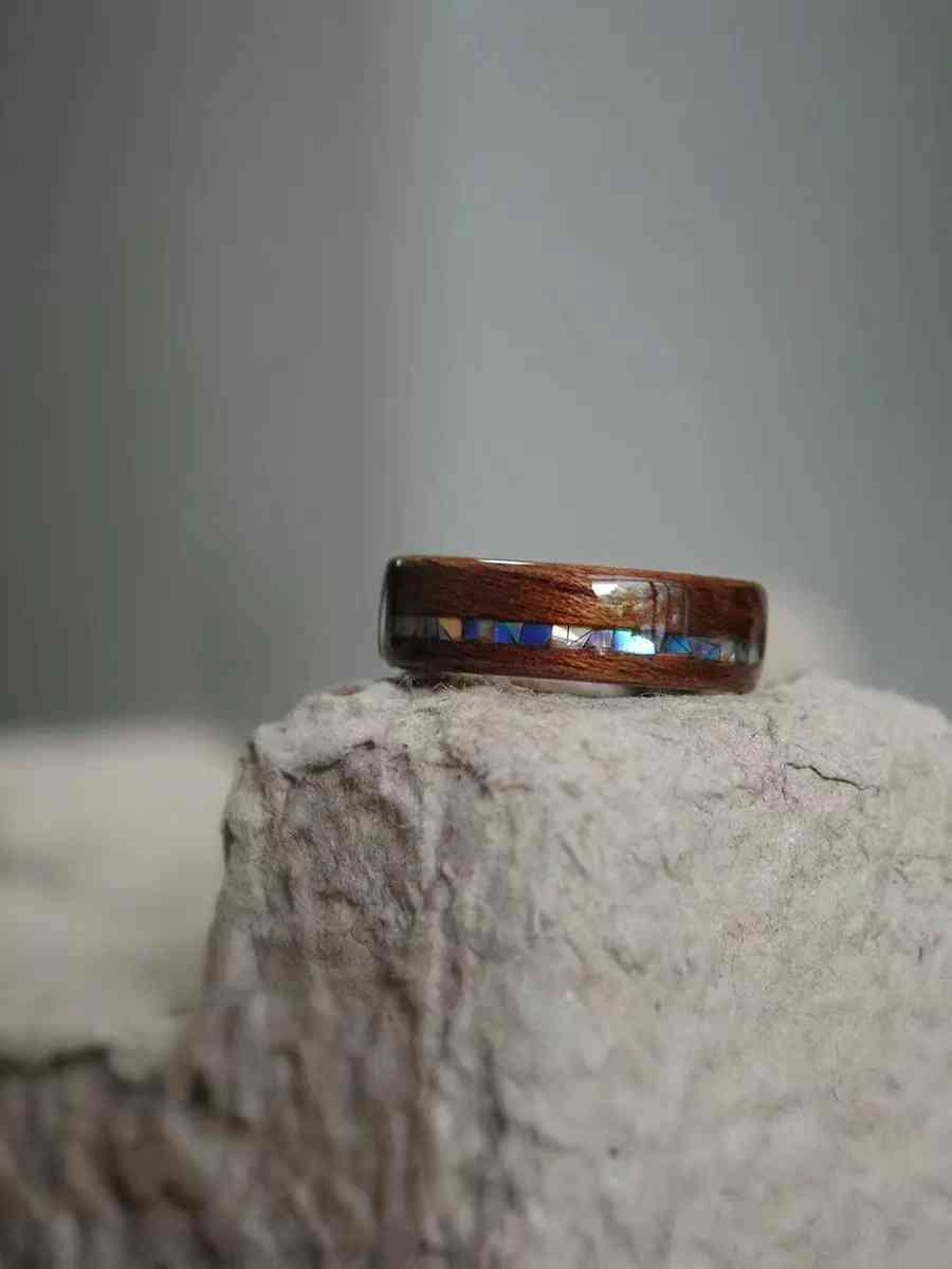 他家的木質(zhì)戒指有素圈的,也有鑲嵌水晶、貝片的。我要推薦的這款戒指,就是在表面鑲嵌了一圈不規(guī)則的水晶,讓戒指看起來古樸又個性、活潑,適合送女生。