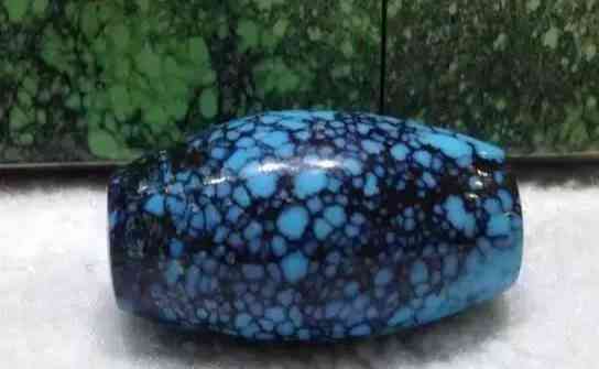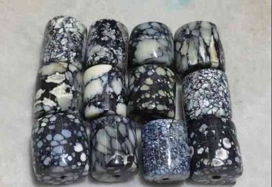 新疆松,仿真度極高的白松(菱鎂礦加色),這是做假天珠的人所做的創(chuàng)新品種,把看不見的石紋變成可見的黑色線紋,以假亂真。