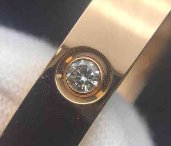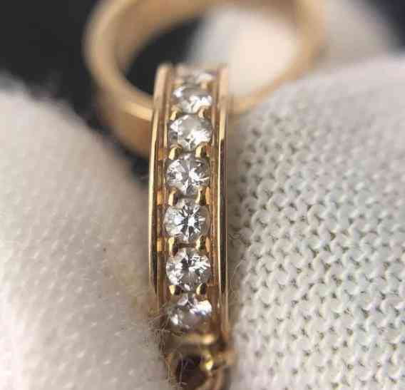 日子圈,底槽有圈狀打磨紋,且中間橫線凹槽兩端與圓形底槽不在一個水平面上。鑲鉆款,所有鉆石顏色凈度一致。包鑲款,包邊很薄,邊緣整齊倒角打磨;群鑲鉆款,鑲爪做工精細,鉆石大小一致排列整齊。