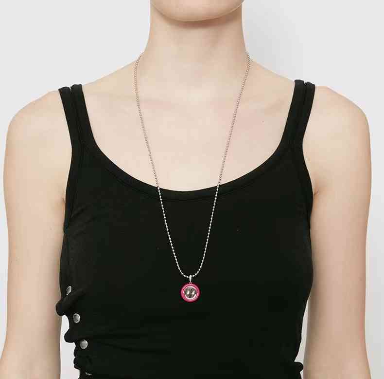 這款電鍍琺瑯笑臉項鏈由銅鍍18K金的笑臉和外圍的彩色琺瑯構成,其中最特別的就是笑臉外圍的琺瑯裝飾,五顏六色的琺瑯裝飾讓笑臉看起來更個性、時尚,佩戴起來也給人一種很清新、明亮的感覺,是很適合夏天顏色。