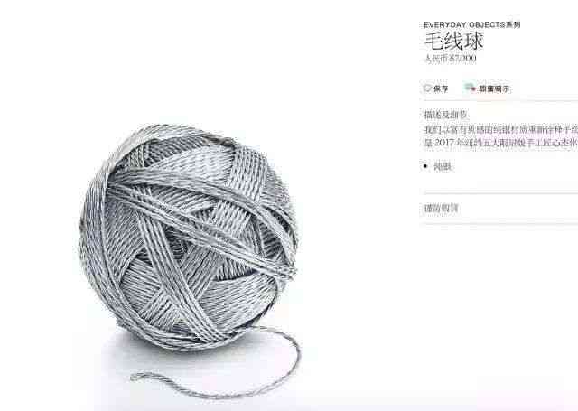 再有就是這個銀線球,官網(wǎng)標(biāo)價87000一個,我沒寫錯零,就是八萬七!有網(wǎng)友調(diào)侃,八萬七一個毛線球,織一件毛衣得用多少個啊?當(dāng)然,調(diào)侃歸調(diào)侃,人家真買這個銀線球回去估計也不會拿來織毛衣,可能也就是個藝術(shù)的擺設(shè)。