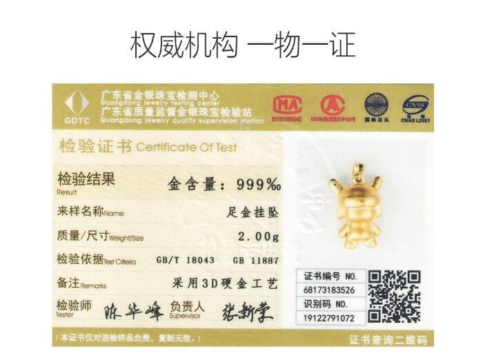 小米有著極其龐大的粉絲群體,而且米粉有著極高的忠誠(chéng)度,小米往往推出一項(xiàng)產(chǎn)品都會(huì)熱銷,早在2014年的時(shí)候黎萬強(qiáng)就表示小米玩偶米兔銷量突破200萬??磥硇∶椎姆劢z對(duì)于小米的吉祥物也有著極大的熱情,這么看來推出純金的項(xiàng)鏈也是順理成章的事情。這款LuckyME米兔足金吊墜,還有廣東省金銀珠寶檢測(cè)中心的檢測(cè)證書,可以看到金含量是999‰的千足金,重量為2g。