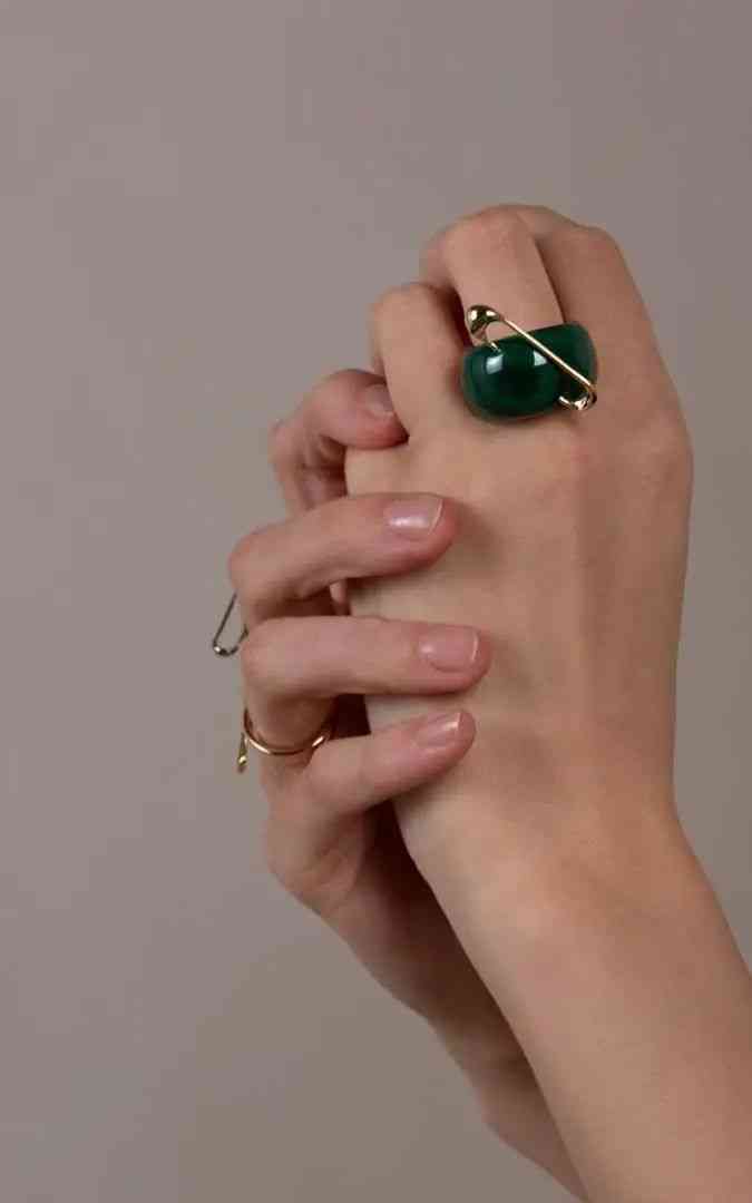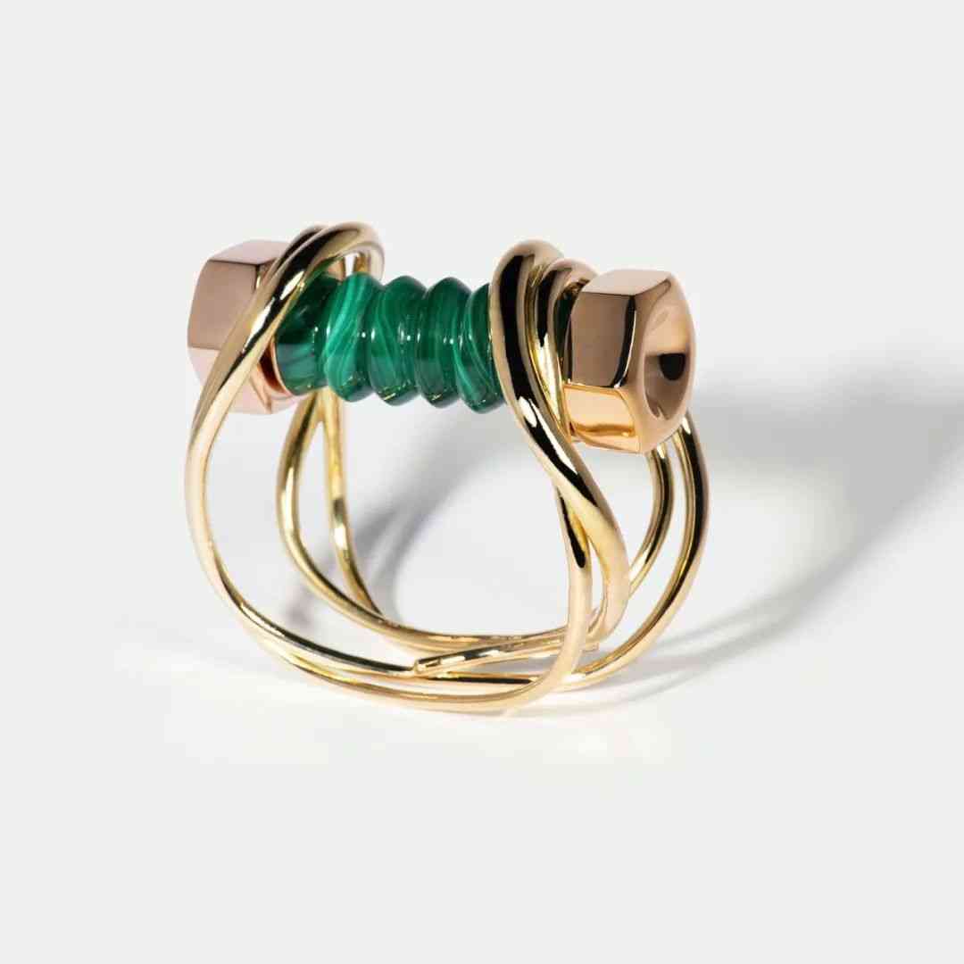 英國珠寶設(shè)計(jì)師漢娜·馬丁憑借另類前衛(wèi)的珠寶設(shè)計(jì)風(fēng)格出圈,推出了“A New Act of Rebrllion”系列。在她的珠寶設(shè)計(jì)中,有工業(yè)風(fēng)的別針穿過孔雀石戒指,也有超出比例的大號(hào)鏈環(huán)構(gòu)成的金手鏈,其中的明星款是一件手鐲,上面有孔雀石雕刻而成的螺栓,就像一個(gè)真正的螺栓一樣,兩端都有金螺母,用一根金線將螺栓連接在手腕上。