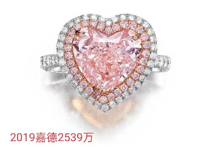 位列第七的是中國嘉德2019香港秋季拍賣會(huì)上成交的一枚嵌4.58克拉粉鉆的鉆石戒指,成交價(jià)為2539萬元。