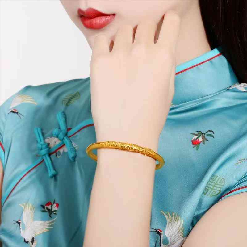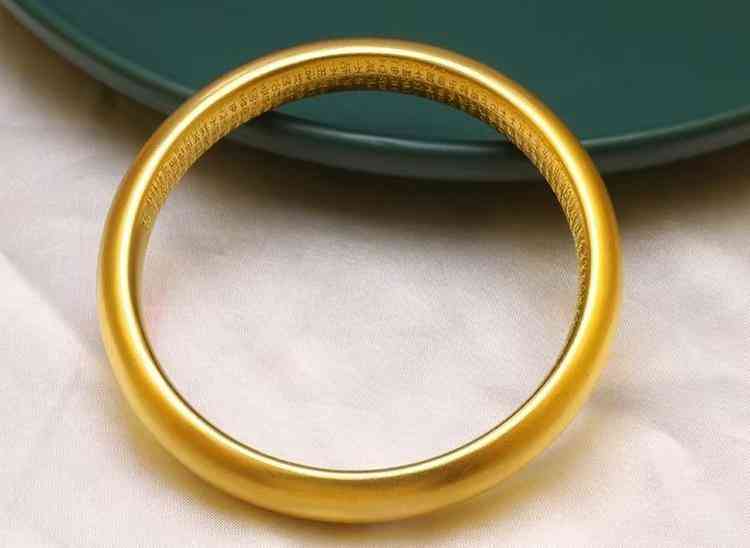 外圈花紋圓鐲:內(nèi)圓外圓的古法黃金手鐲,在手鐲外側(cè)表面雕刻有蓮花、金剛經(jīng)等花紋,也是經(jīng)典的古法黃金手鐲之一。