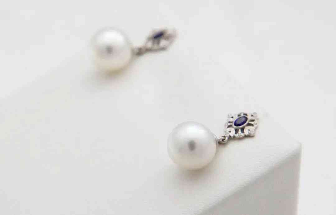 9-10mm澳洲南洋冷光白珍珠配18K白金鉆石鑲藍(lán)寶石耳釘