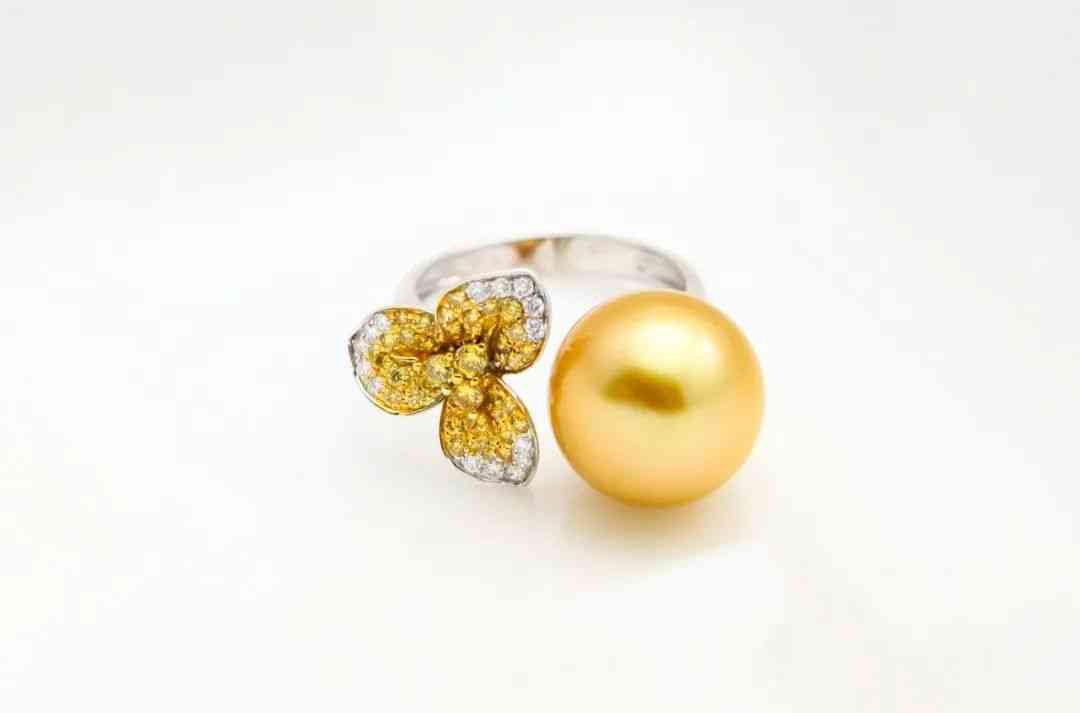 12-13mm南洋極度濃金珍珠配18K黃金鉆石三葉草款戒指