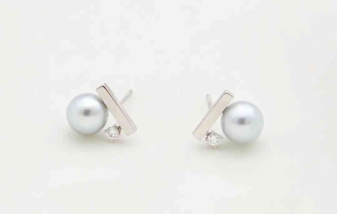18K白金鉆石日本田崎Tasaki平衡木款A(yù)koya真多麻銀灰色7-8mm珍珠耳釘