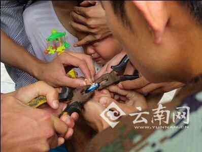 官兵發(fā)現(xiàn)該小孩手指已經(jīng)磨破,且指尖變紫,如果不取下戒指,手指可能因長時間血液循環(huán)不暢而壞死。由于蓋子是鋁合塑膠,而且比較硬,整個救援過程容不得有絲毫馬虎。