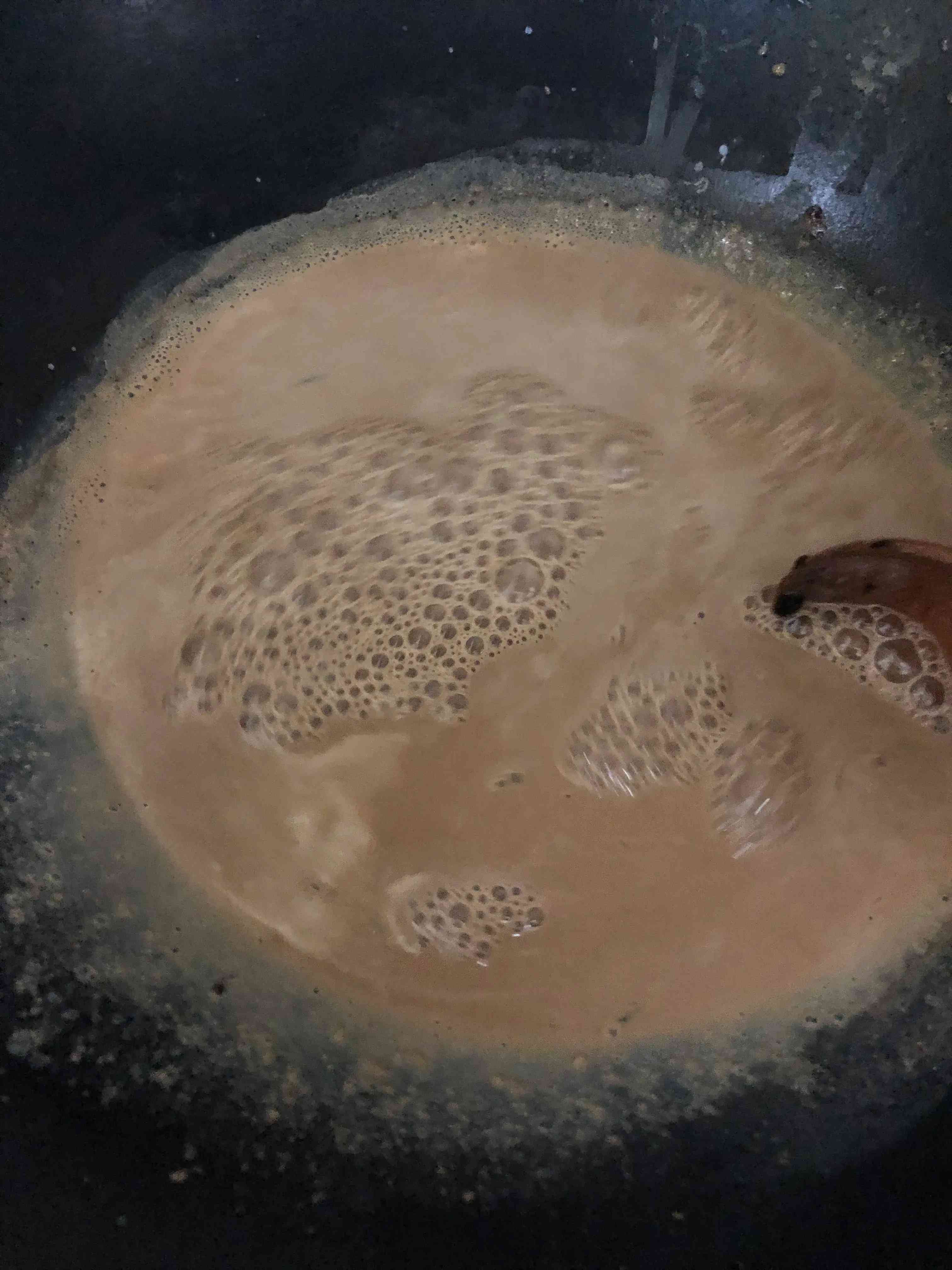 2、燒到紅糖全部融化出現(xiàn)好多氣泡倒入純牛奶,此時(shí)融化的糖因牛奶倒入溫度降低而變硬。不斷攪拌,直至感覺無(wú)硬塊即可關(guān)火。