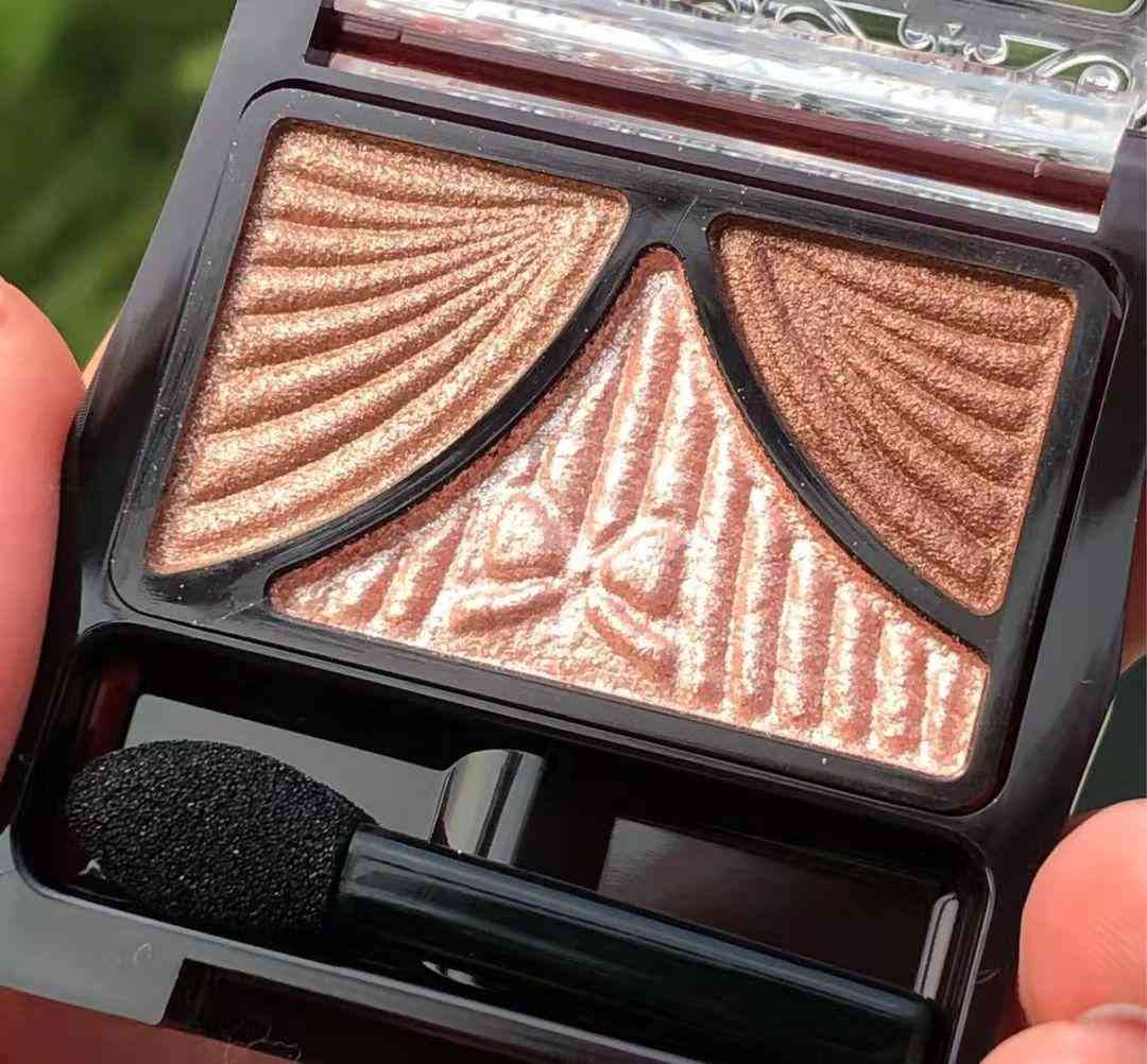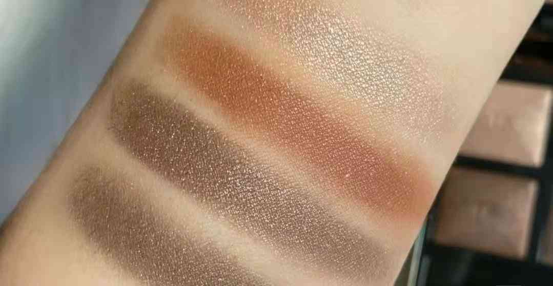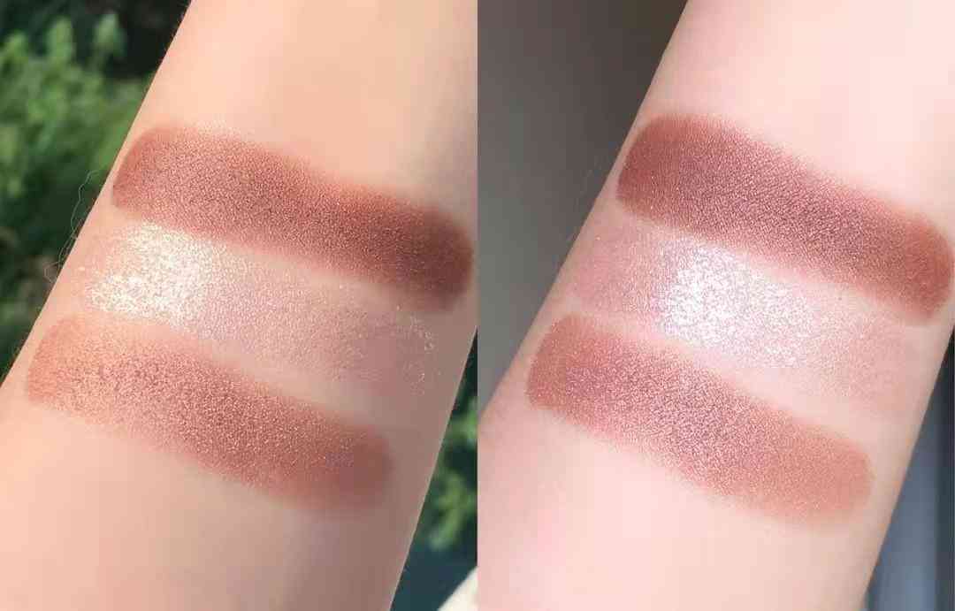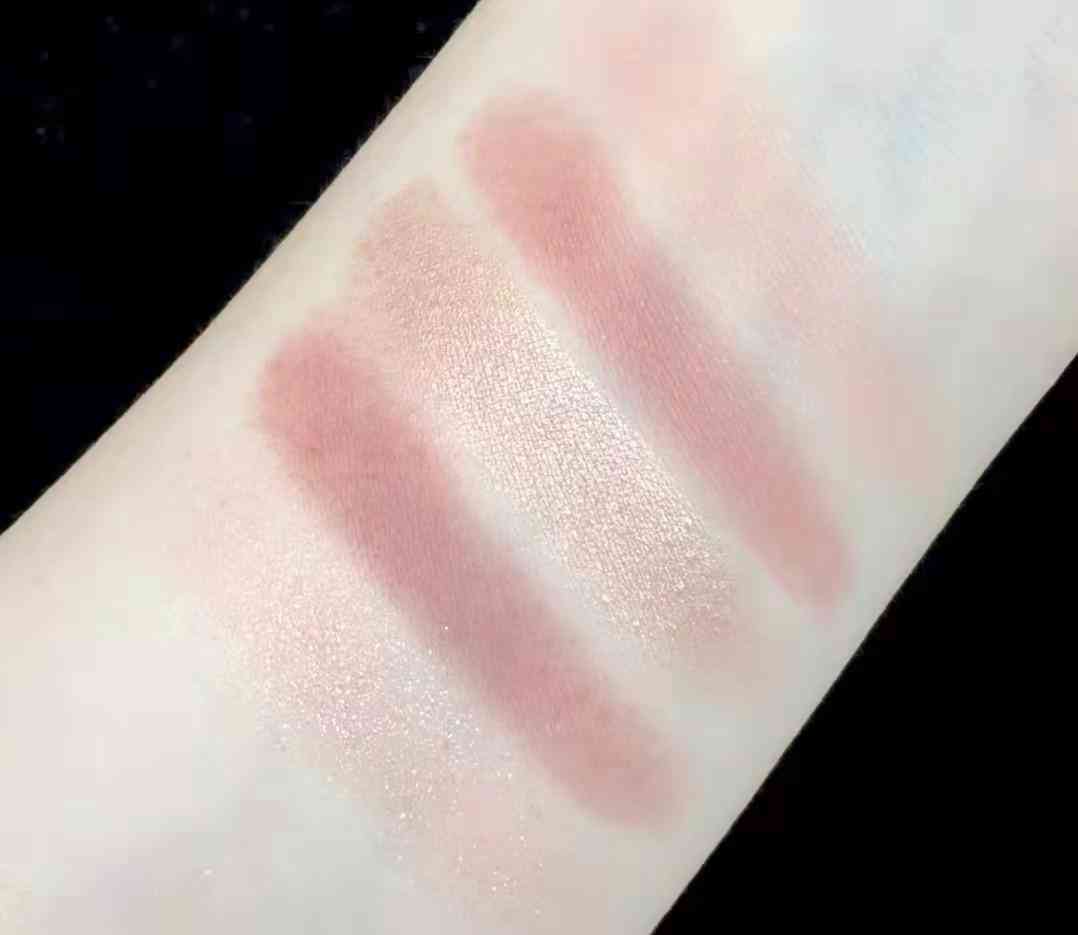 這盤的亮片色,在眼影盤中看起來有點(diǎn)廉價(jià),但是抹開在皮膚上才會(huì)發(fā)現(xiàn),細(xì)閃色通透感非常漂亮,點(diǎn)綴在眼頭或是提亮臥蠶都很合適。另外兩款顏色,以棕調(diào)為主,色彩比較濃郁,很適合單獨(dú)涂抹,或者加眼妝加深色。