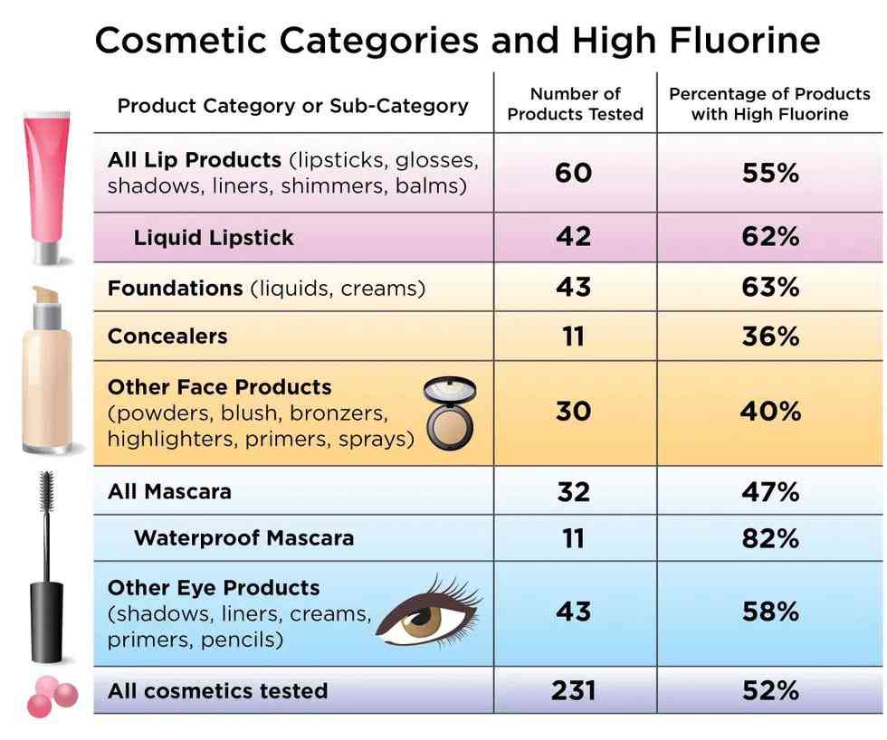 加州伯克利的綠色科學(xué)政策研究所的高級科學(xué)家、研究員Tom Bruton介紹道,研究人員在美國和加拿大購買了231種不同的化妝品,并對它們進行了氟檢測,其中有一半以上的種類含氟量高。而在213種高氟產(chǎn)品中,化妝品類別所占比例最高的是粉底(63%)、眼部產(chǎn)品(58%)、睫毛膏(47%)和唇部產(chǎn)品(55%)。