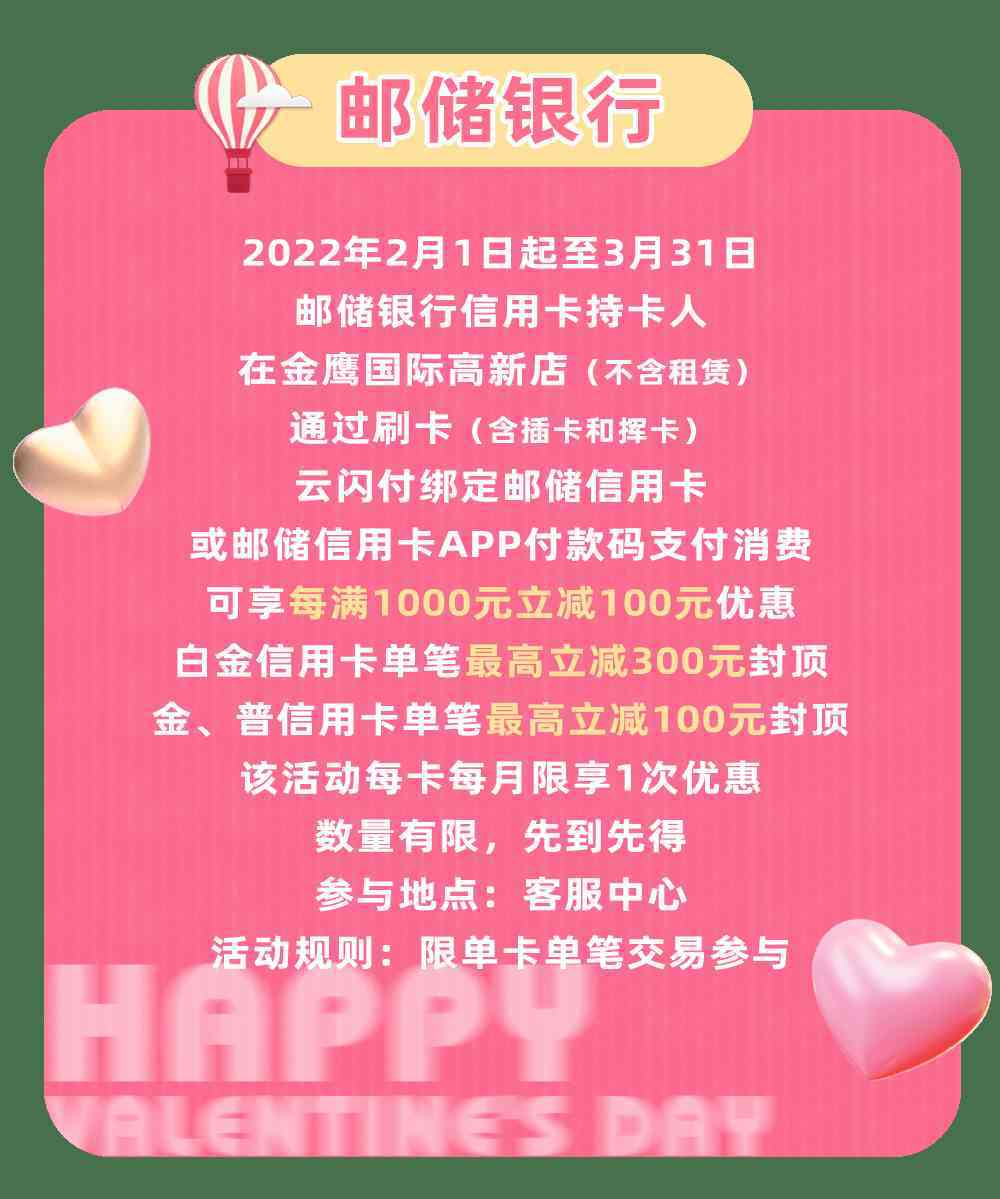 單筆交易滿1000用100元,可與中心活動疊加使用,不與商場其他券同享。2月14日當天券升值50%使用,使用規(guī)則不變(滿1000減100);