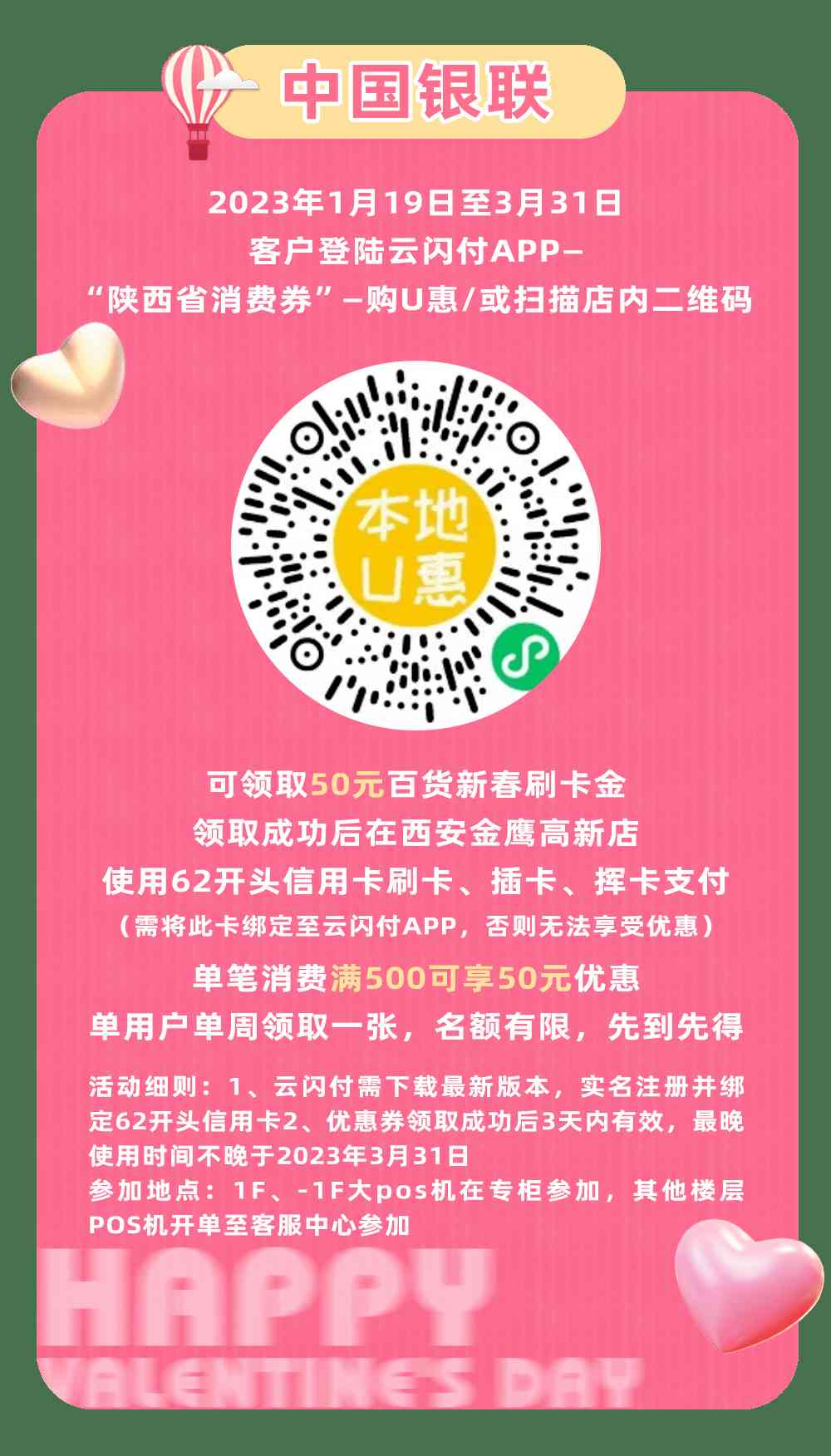 單筆交易滿500用100元,不與商場其他活動同享。2月14日當天券升值50%使用,使用規(guī)則不變(滿500減100)。