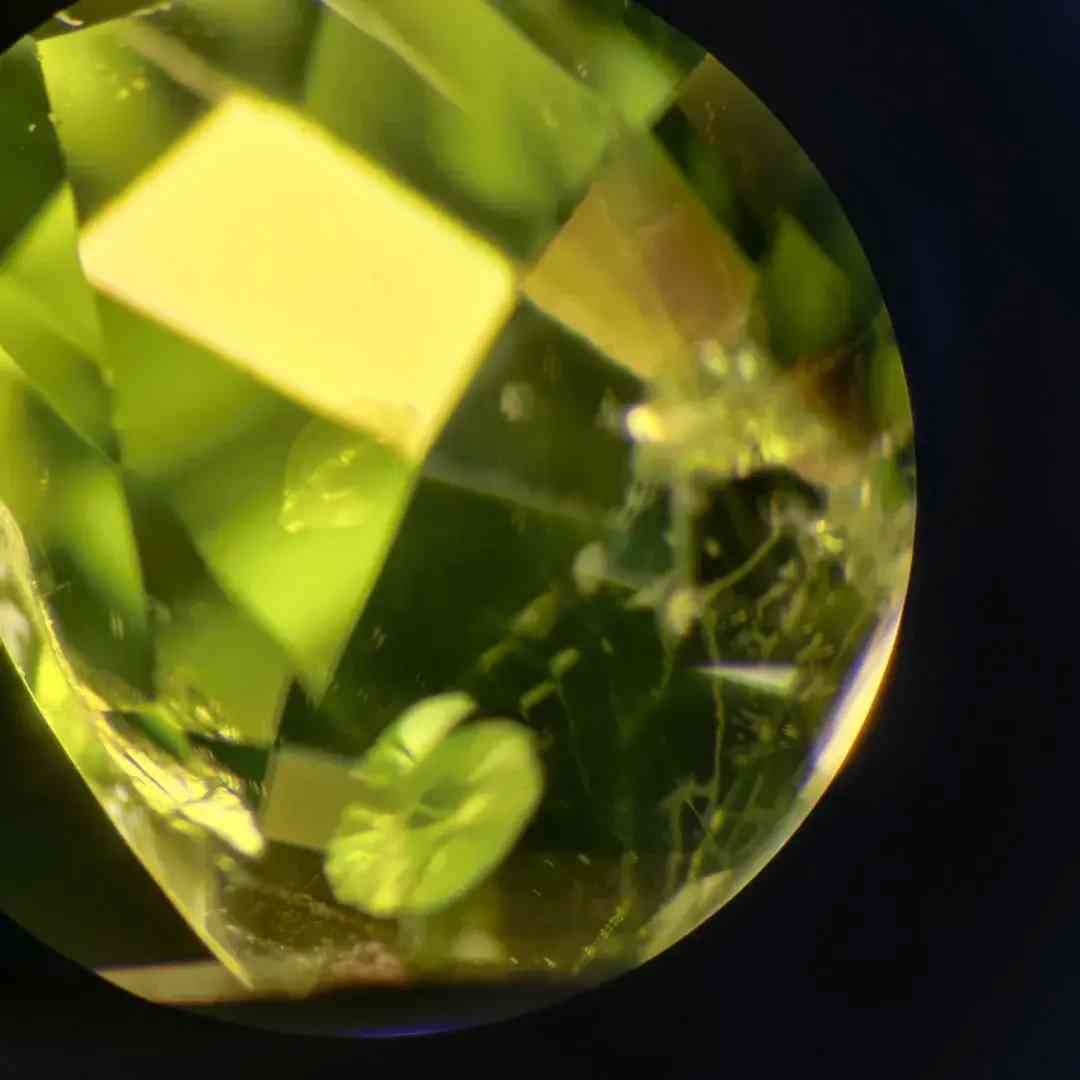 ■ 折射率與雙折射率:橄欖石折射率為1.654-1.690,從折射率也能看出其雙折射率很大,為0.035-0.038,常為0.036。正因?yàn)槠漭^大的雙折射率,通過(guò)臺(tái)面可以非常清楚地看到刻面棱重影,這也是橄欖石與其他綠色相似寶石鑒定依據(jù)之一。(劃重點(diǎn),之后要考的喲?。?/p>