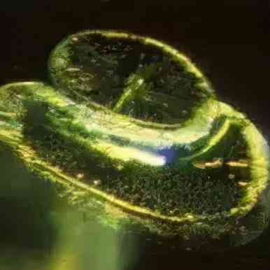 ■ 內(nèi)外部顯微特征:橄欖石在顯微鏡下放大觀察常見(jiàn)礦物包體,一般為黑色鉻鐵礦包和深紅褐色鉻尖晶石等,這些礦物包體的周?chē)0殡S盤(pán)狀應(yīng)力紋,這種類(lèi)型的包體像極了生活中常見(jiàn)的睡蓮葉,于是就被人們稱(chēng)為“睡蓮葉“”狀包體。這也是其特征包體,具有十分重要的鑒定意義喲!