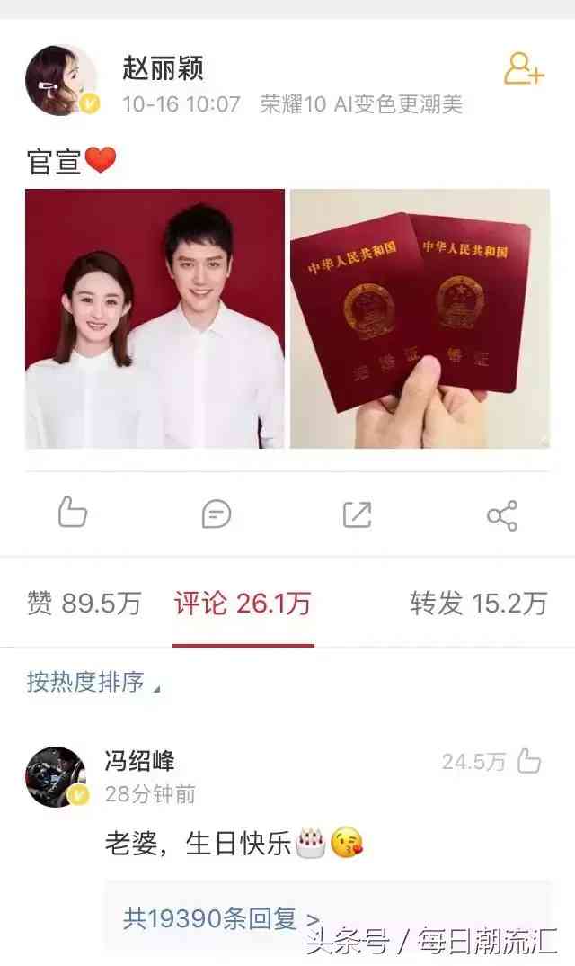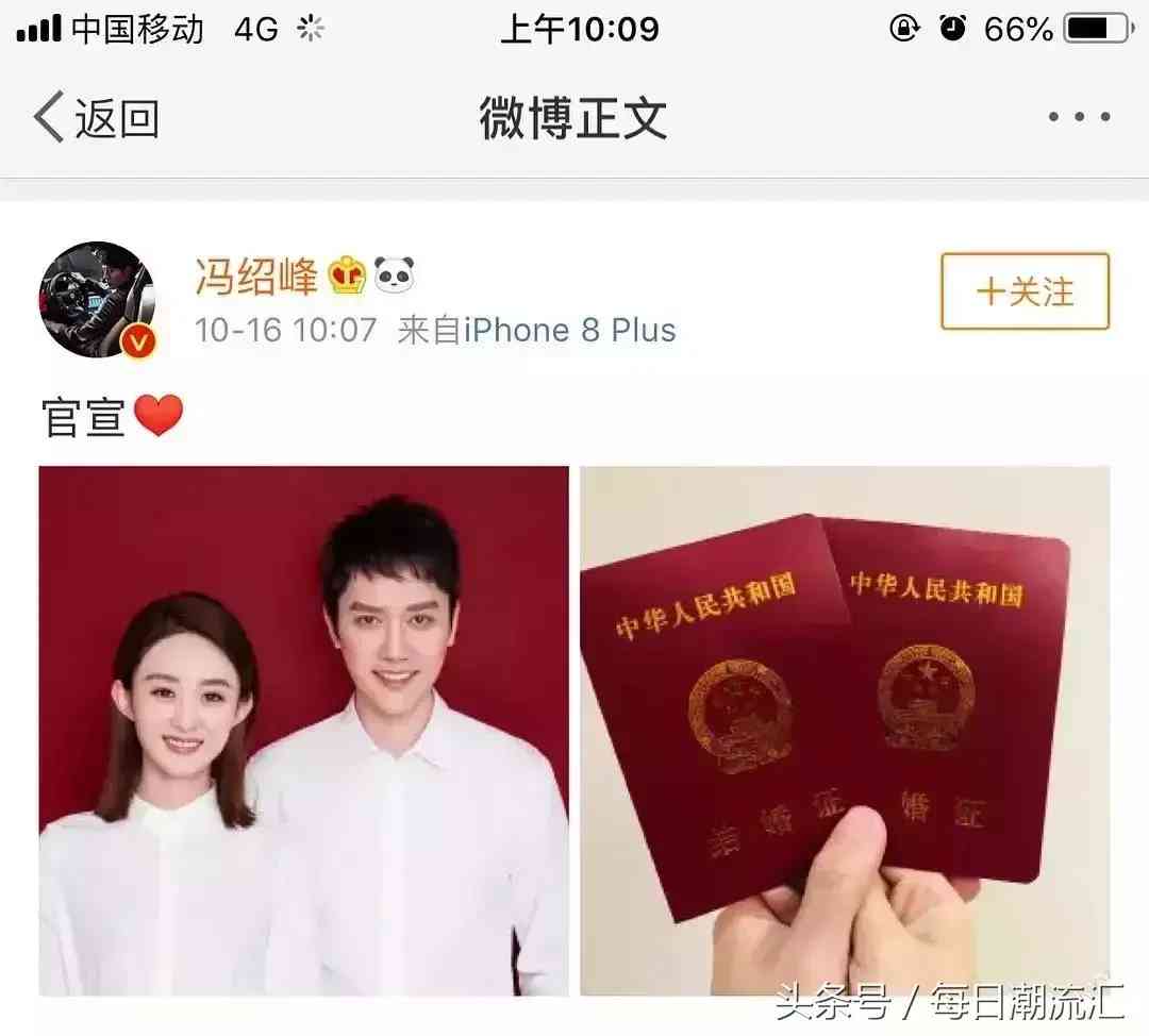 導(dǎo)讀: @馮紹峰@趙麗穎官宣了他們結(jié)婚的喜事!昨天早上,趙麗穎馮紹峰在微博公布戀情,并曬出了結(jié)婚證。不到一小時(shí),就迎來了百萬點(diǎn)贊...