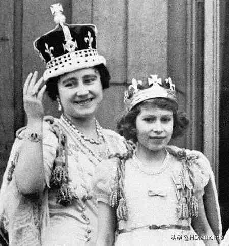 △1936英國喬治六世繼位時(shí),妻子伊麗莎白王后便以鉑金鑲鉆皇冠加冕,圖為伊麗莎白王后和少女時(shí)期的現(xiàn)任伊麗莎白女王