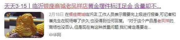 此外,就在今年2月中旬,還有媒體報(bào)道稱,某消費(fèi)者購買的印有老鳳祥和足金標(biāo)記的黃金擺件,經(jīng)鑒定含金量為977.1‰,達(dá)不到足金標(biāo)準(zhǔn)(含金量達(dá)到990‰以上)。