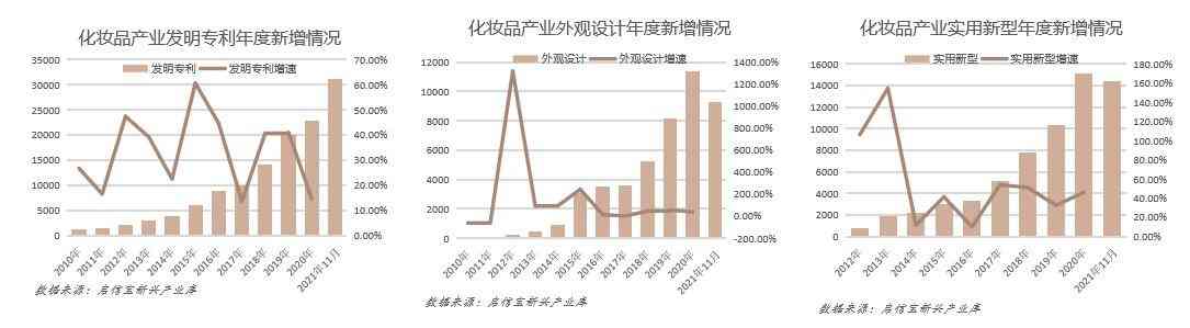 行業(yè)的快速發(fā)展也帶動了產(chǎn)業(yè)創(chuàng)新。近年來,化妝品產(chǎn)品在成分、功效以及包裝等方面創(chuàng)新不斷,化妝品產(chǎn)業(yè)發(fā)明專利每年新增數(shù)量也逐年上升,但近兩年新增專利增速有所放緩。2021年1-11月新增發(fā)明專利數(shù)量超過3萬件。外觀設(shè)計的知識產(chǎn)權(quán)數(shù)量,2020年增加超過1.1萬件?;瘖y品產(chǎn)業(yè)的實用新型專利新增數(shù)量相對低于發(fā)明專利數(shù)量。
