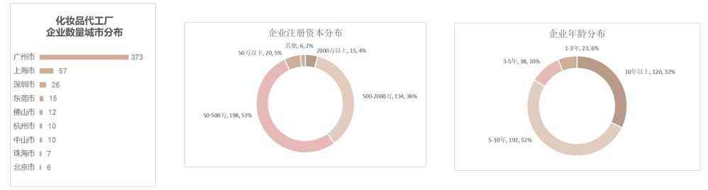 啟信寶數(shù)據(jù)顯示,被譽(yù)為“化妝品代工之都”的廣州,代工廠有373家,是全國擁有化妝品代工廠企業(yè)數(shù)量最多的城市。從企業(yè)注冊資本分布來看,注冊資本2000萬以上的企業(yè)有15家,占比15%,占比第二的區(qū)間為50-500萬之間,有198家企業(yè),占比為53%。成立時間大于10年以上的企業(yè)有120家,占比32%。
