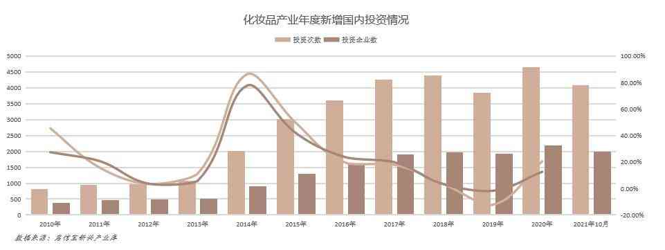 化妝品產(chǎn)業(yè)的年度新增融資金額增長情況與融資次數(shù)相似,在2016年達(dá)到峰值,近幾年則呈現(xiàn)下降趨勢,同時,化妝品產(chǎn)業(yè)投資企業(yè)數(shù)增長趨勢也呈現(xiàn)“先增后降”趨勢,在2014年增速達(dá)到最大值,超過80%,此后增速開始下降。