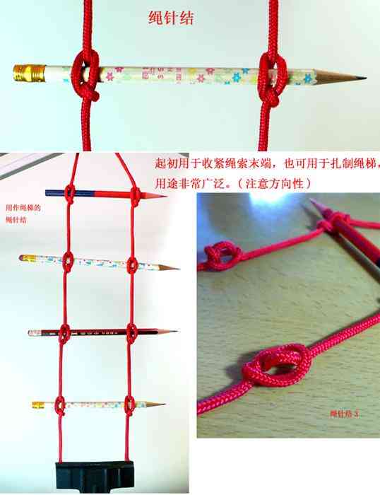 營繩結(jié)主要用在帳篷四周的營繩上,可以調(diào)整長短,適用于各種粗細(xì)不同的繩索,又被稱為緊索結(jié)。