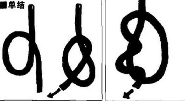 單結(jié)在繩結(jié)中歷史最長,也是最簡單的一種結(jié)法。在西方,單結(jié)的叫法很多.如交腕結(jié)、拇指結(jié)等。單結(jié)是所有復(fù)雜繩結(jié)的基礎(chǔ),但是單結(jié)的缺點(diǎn)是很容易松開,因此多配合其它結(jié)繩方式使用。