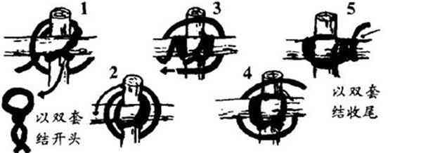 方回結(jié)的作用和十字結(jié)相似,都是以雙套結(jié)開始,同樣也是以雙套結(jié)收尾。結(jié)法上最大的區(qū)別是繩子纏繞的方向不同:十字結(jié)采用交叉斜角纏繞,而方回結(jié)采用垂直徑向纏繞,因此方回結(jié)只能將兩根交叉木棒捆扎成90度角。