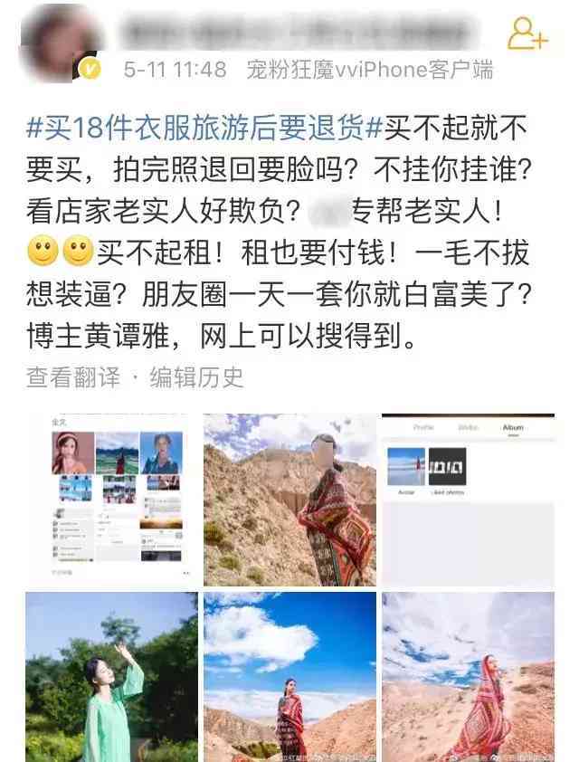 但其實,五一期間,那顧客早就將部分衣物穿出去遛了一圈,還在朋友圈發(fā)那種高大上的旅游照。