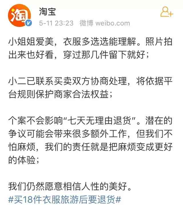 一位淘寶店家爆料,五一假期后,有個顧客將 18 件衣服退貨,用的是“七天無理由退貨”。