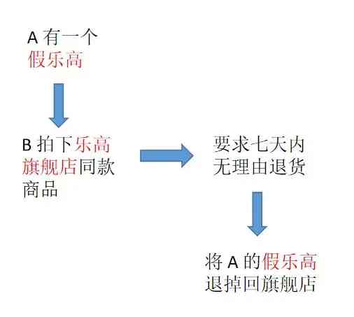 舉個栗子,A 有一個假的樂高玩具,他讓群里的 B 去樂高旗艦店下單,買一個同款玩具。