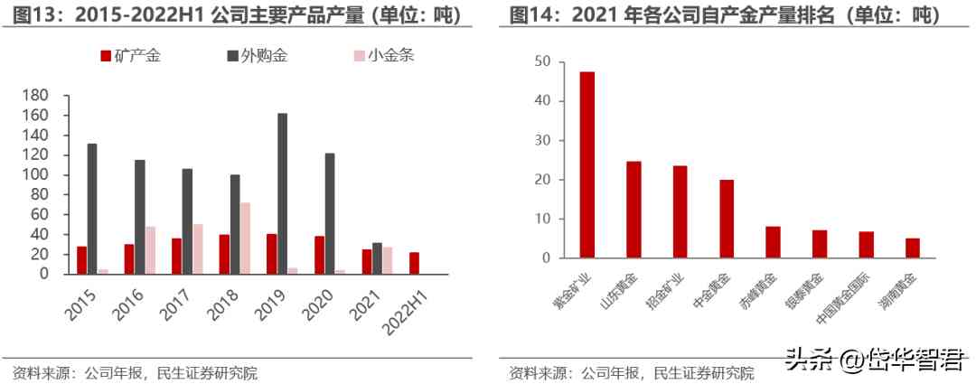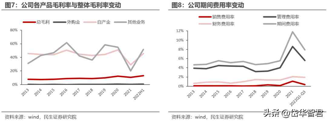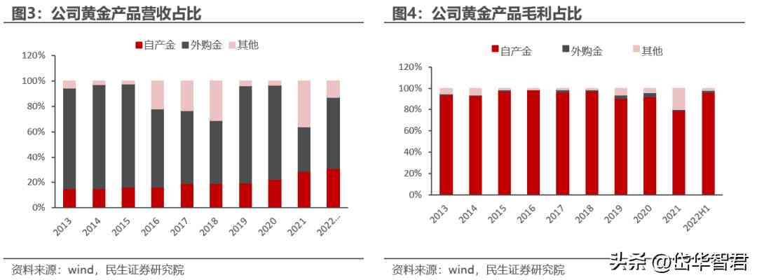 從毛利占比來看,歷年來自產(chǎn)金基本貢獻90%以上的毛利潤,其他業(yè)務(wù)毛利占比較少,2022年H1數(shù)據(jù)顯示自產(chǎn)金毛利占比達到96.61%,主營業(yè)務(wù)高度聚焦。