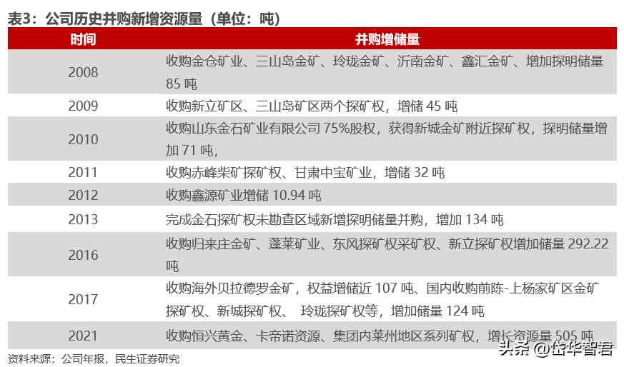 公司上市之前主要資產(chǎn)為萊州半島的新城金礦,上市后利用A股上市募集的資金并購集團公司旗下的焦家金礦,2008-2016年公司進一步收購集團體內(nèi)三山島、玲瓏金礦、蓬萊金礦等優(yōu)質(zhì)資產(chǎn),實現(xiàn)大幅增儲擴產(chǎn)。