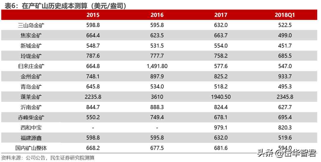 受益于礦山的地質(zhì)優(yōu)勢、公司已開發(fā)的基礎(chǔ)設(shè)施、先進的技術(shù)及流程以及強大的產(chǎn)能,使得公司開采能力強、平均貧化率和平均采礦損失率低于行業(yè)平均水平、選礦回收率高,因此礦山的克金成本具有優(yōu)勢,2017年公司國內(nèi)礦山的平均現(xiàn)金成本為681.6美元/盎司,低于當(dāng)年行業(yè)平均現(xiàn)金運營成本的715美元/盎司。