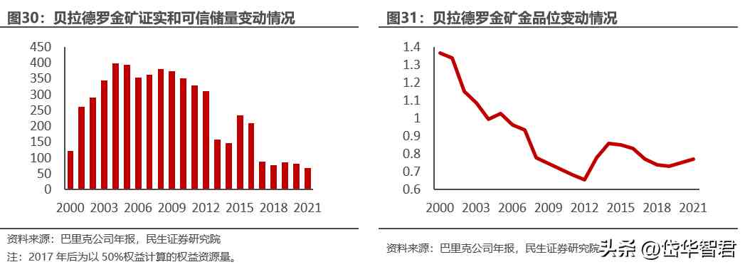 根據(jù)巴里克公司年報,貝拉德羅金礦于2005年投產(chǎn)運營,目前已運營17年,隨著礦山運營年限增長和礦區(qū)深入開采,貝拉德羅金礦儲量和金品位出現(xiàn)下降,截至2021年貝拉德羅金礦儲量為68.43噸,平均原礦品位為0.77g/t。