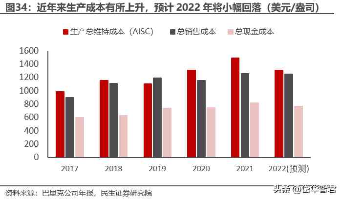 根據(jù)巴里克2021年年報預(yù)測,2022年貝拉德羅AISC成本將小幅下降,回落至1270-1350美元/盎司,未來隨著2023年輸電項目的建設(shè)完成,公司將停止運營現(xiàn)場的高成本柴油發(fā)電場,能源成本將顯著降低。