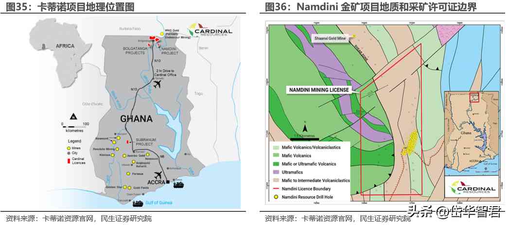 公司2021年完成收購卡蒂諾資源100%股份,其核心資產(chǎn)是位于加納的3個礦權(quán),分別是位于加納東北部Bole-Nangodi成礦帶的Namdini開發(fā)項目和Bolgatanga勘探項目,以及位于加納西南部Sefwi成礦帶的Subranum勘探項目。Namdini礦權(quán)采礦租約面積為63平方公里,礦權(quán)期限為15年,為目前在建核心項目。