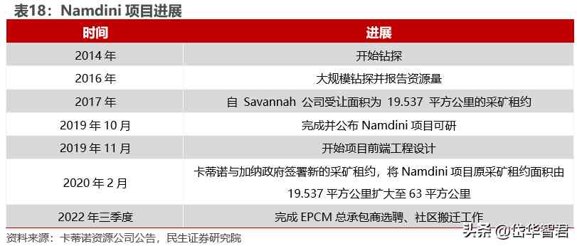 Namdini項目建設(shè)不斷推進,投產(chǎn)未來可期。Namdini項目目前處于投產(chǎn)前期工作。截至2022年三季度,Namdini已經(jīng)完成了EPCM總承包商的選聘工作和社區(qū)搬遷工作,目前正在推進項目施工圖設(shè)計、設(shè)備選型等項目建設(shè)的相關(guān)工作。