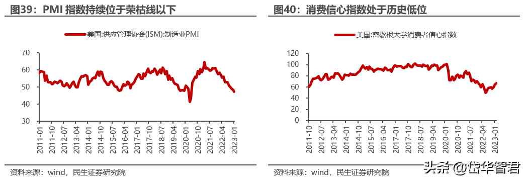從制造業(yè)端來看,美國ISM制造業(yè)PMI指數(shù)子2022年6月份以來連續(xù)8個月內(nèi)下降,目前位于枯榮線以下,制造業(yè)投資疲軟。美國消費者信心指數(shù)雖然近期出現(xiàn)反彈,但整體處于10年來低位,反應(yīng)消費者對未來經(jīng)濟預(yù)期仍然較弱。