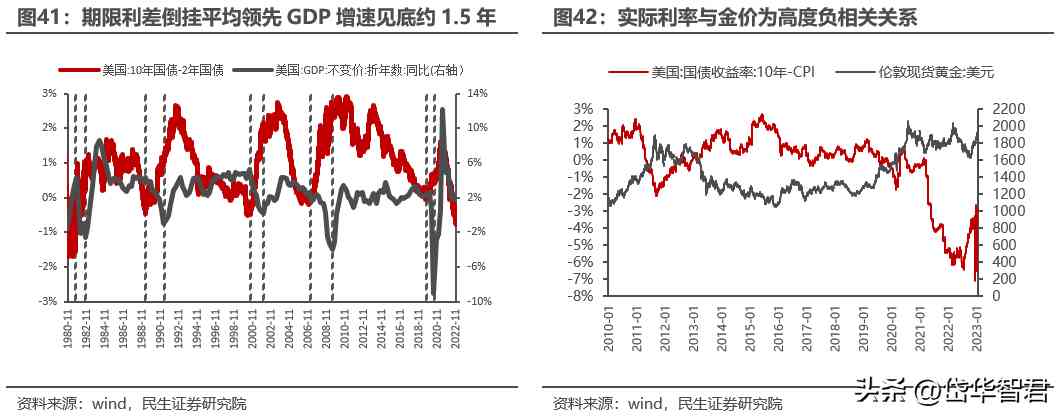 實際利率角度,2023年對金價有利。實際利率作為持有黃金的機會成本,從歷史上來看與金價成高度負相關(guān)。在“實際利率=名義利率-CPI”的模型下,根據(jù)我們的預(yù)測,隨著加息在23年上半年停止,名義利率也將于上半年見頂,隨著美國國內(nèi)經(jīng)濟下行壓力逐步擴大,下半年將呈現(xiàn)趨勢性走弱。