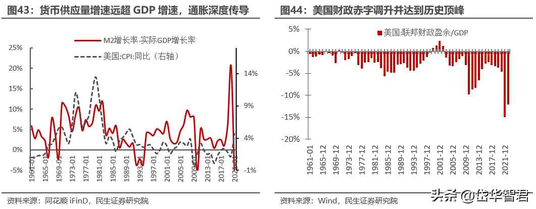 貨幣政策方面,1960-1970s凱恩斯主義的經(jīng)濟政策的大幅運用,使美國財政赤字逐漸擴大,貨幣政策持續(xù)維持寬松,到1969年底,美國財政赤字經(jīng)過累計已經(jīng)出現(xiàn)顯著增長,為后續(xù)十年的通脹埋下了伏筆。2020年新冠疫情爆發(fā)以來,美聯(lián)儲通過大幅增加社會福利支出刺激疫后經(jīng)濟的復(fù)蘇,財政赤字水平大幅走高,與60年代末歷史情況具有類似性。