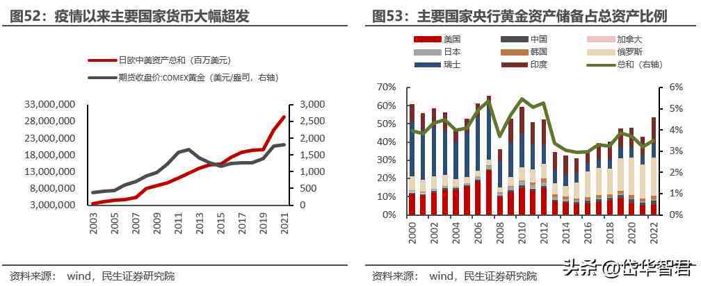 歷史來看,每一輪央行大幅擴表后對應(yīng)的黃金儲備占比會在短期內(nèi)較快速度下降,原因在于黃金的購買量沒有跟上貨幣超發(fā)的速度。全球主要經(jīng)濟體央行2020年以來黃金儲備占央行總資產(chǎn)的比例呈現(xiàn)下降趨勢,盡管2022年央行購金大幅增長,但央行資產(chǎn)中黃金資產(chǎn)占比仍然處于歷史較低位置,預(yù)計未來各國央行有望增加黃金儲備,增補信用。