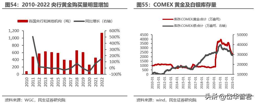 根據(jù)的數(shù)據(jù)顯示,2022年全球央行購入黃金數(shù)量同比大幅增長152.31%,創(chuàng)下歷史新高。2022年 2月份以來,comex黃金和白銀庫存累計分別下降了32%、17%,央行購金已在持續(xù)進行,未來黃金作為最重要的保值增值資產(chǎn),預(yù)計將成為黃金購買的主力。